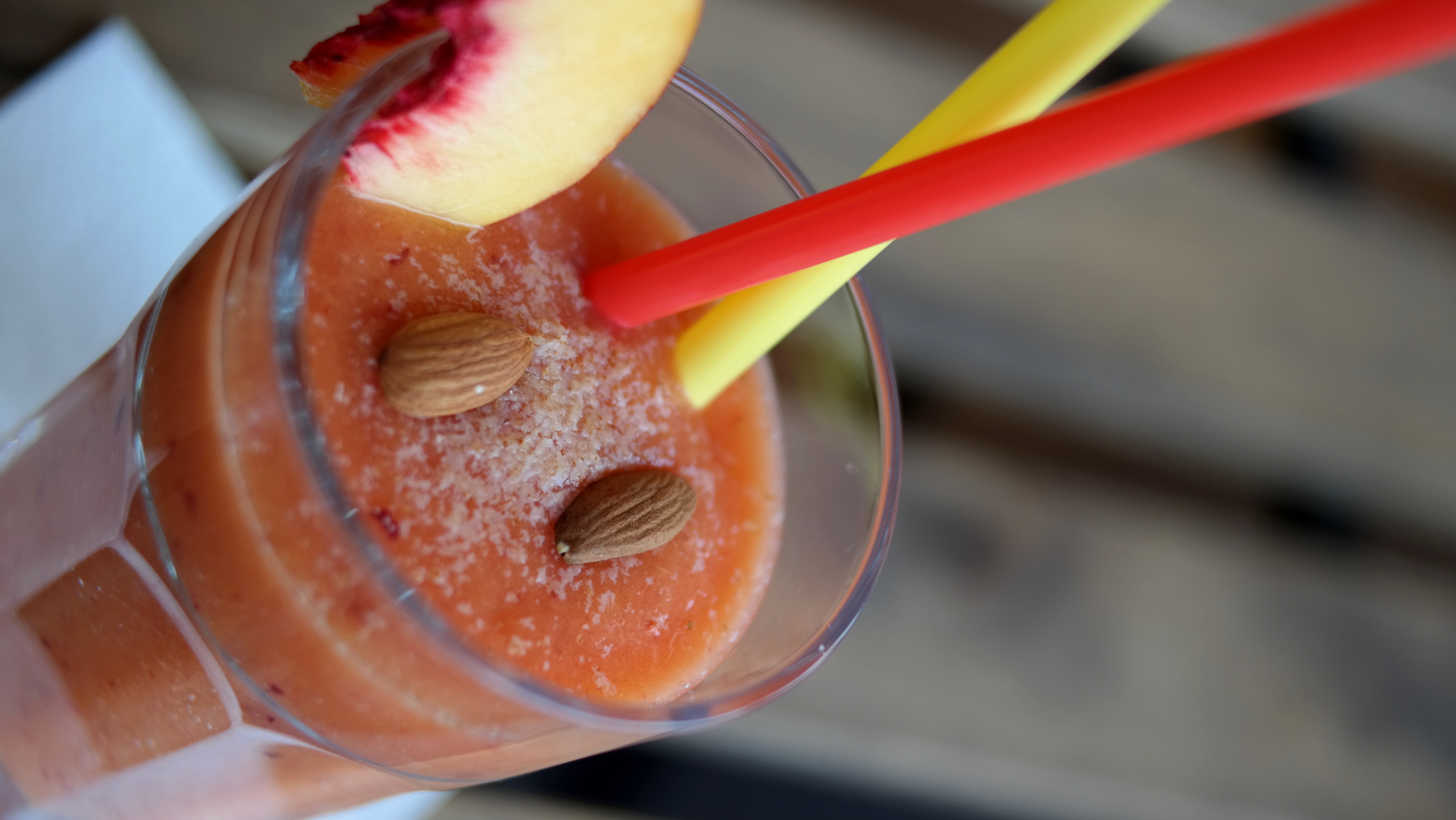 Tagliare la pesca ed il mango a piccoli pezzi, spremere l’arancia e frullarli insieme. Quando la frutta sarà completamente amalgamata versare il contenuto in un bicchiere da frullato. Prendete le mandorle e le grattugiate o pestate sopra il vostro smoothie e mescolate. Il sapore sarà davvero stupefacente!