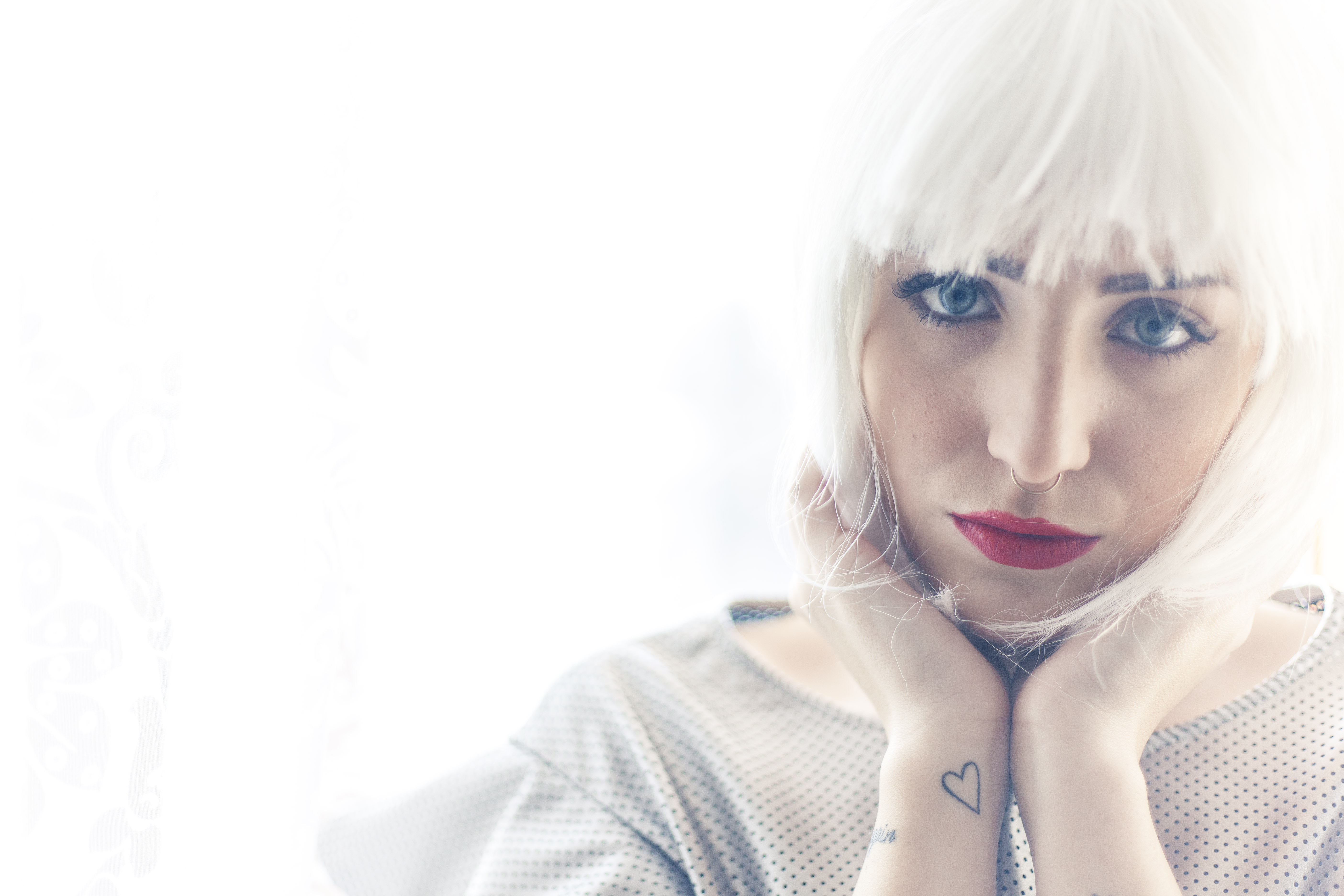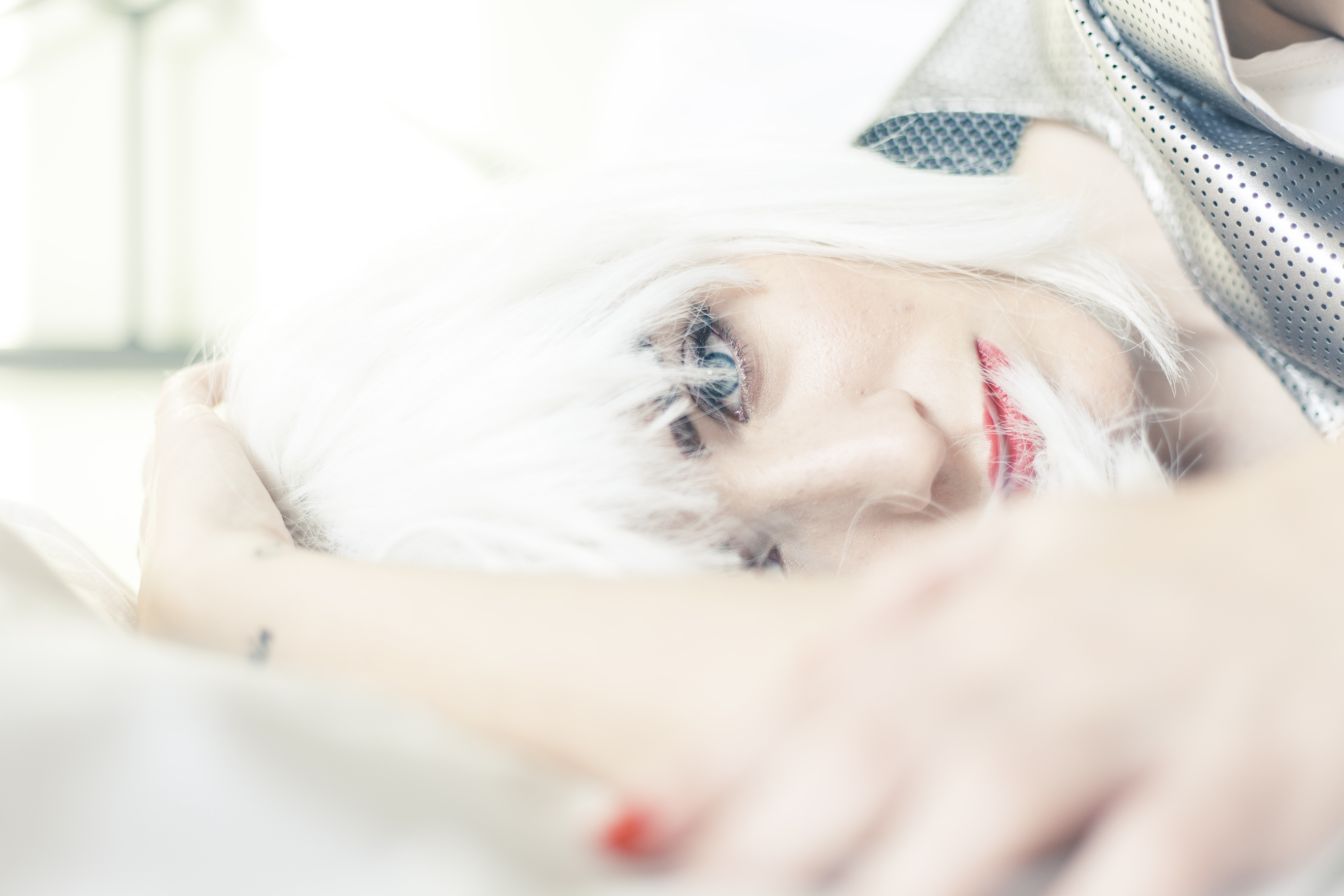 A deep dive in the white, pouring metal. An unexpected publishing, different from usual ones, beginning with my white hair. A glamour style, kind of manga-style. A cocoon-like environment, feeling like soft falling snow with absolute surrounding silence. Suddenly, a glimpse of light, the warm sun on my skin. This gets me into an unexpected, subtle and indefinite mood.