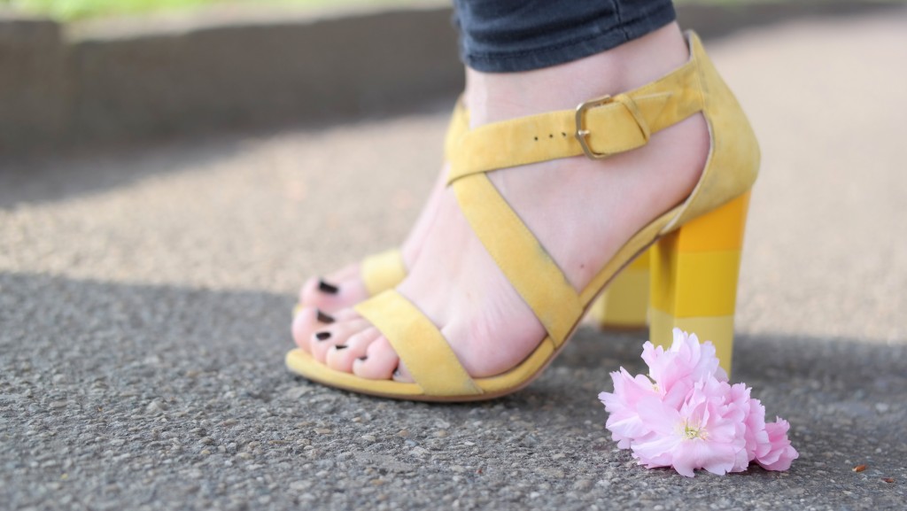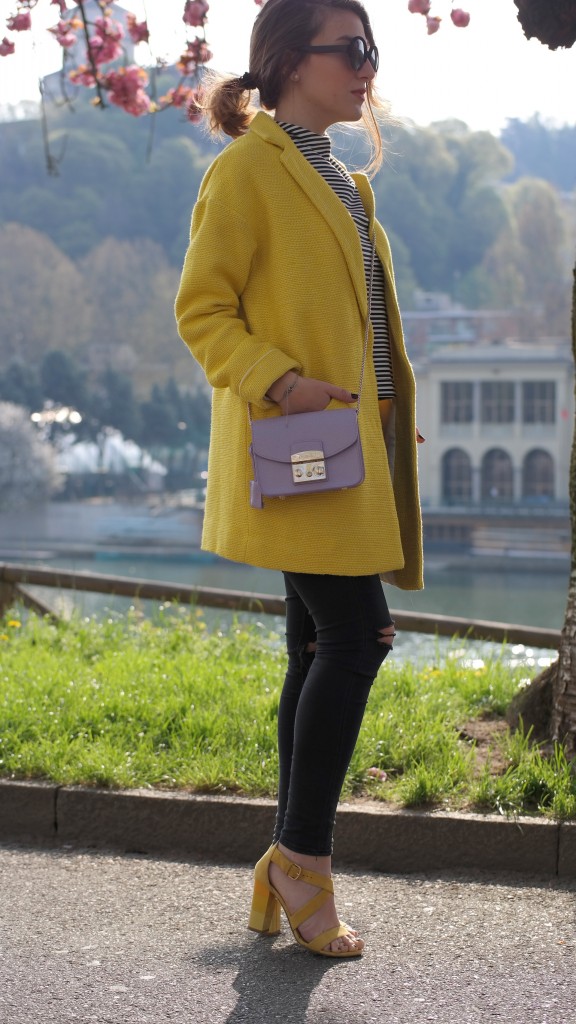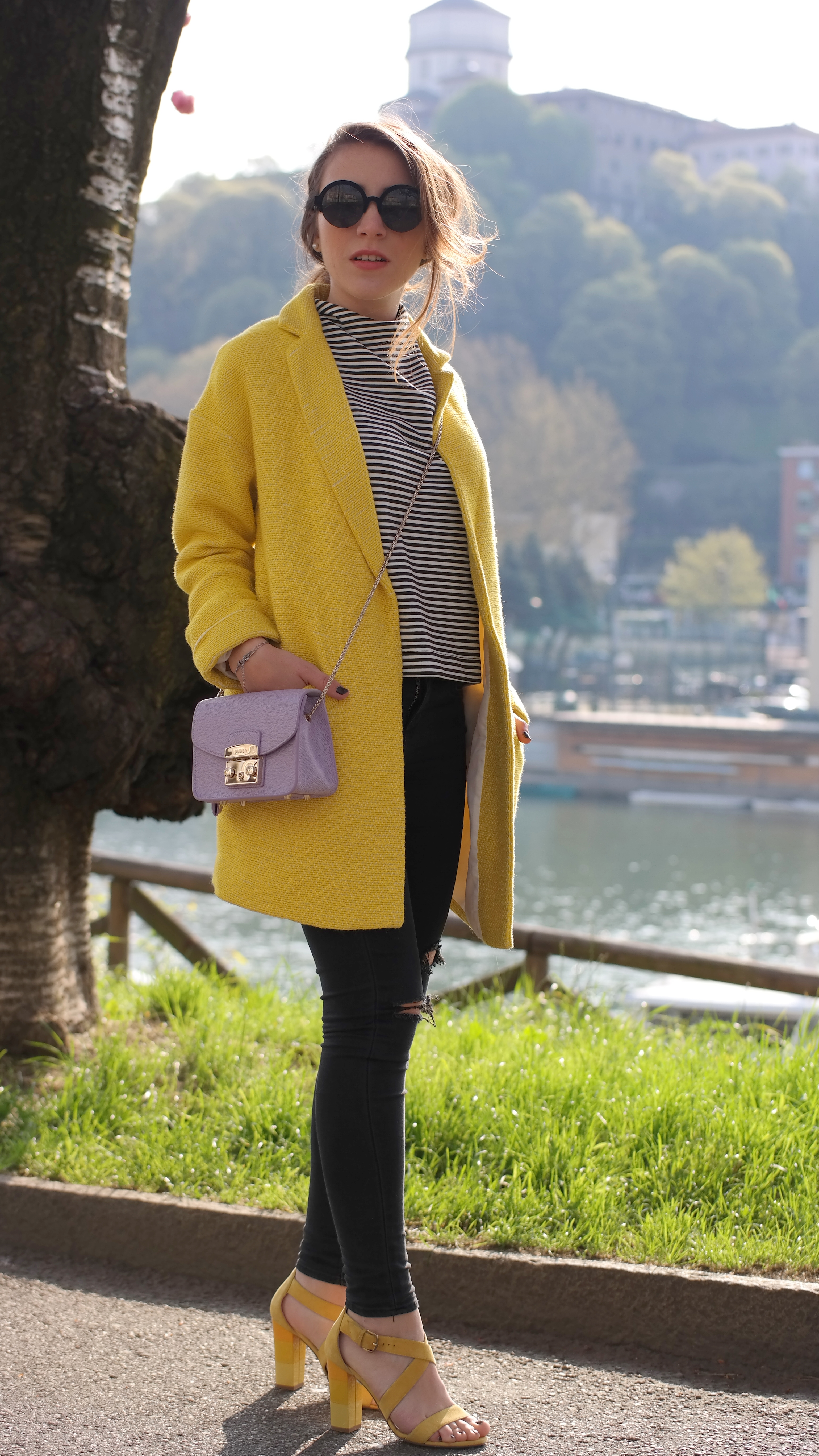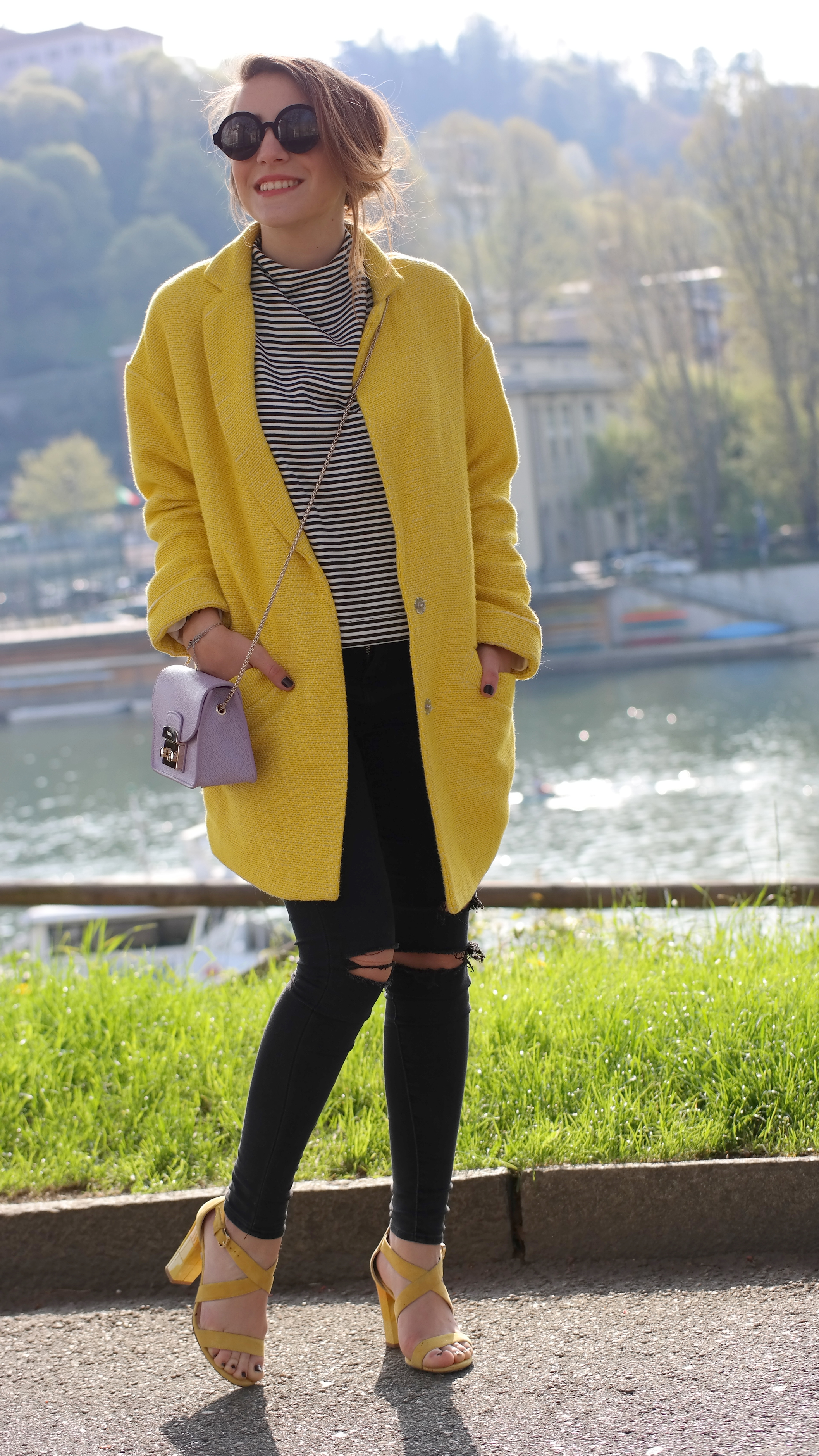 The lemon yellow coat signed Asos making perfect pair with sandals Alberto Guardiani.