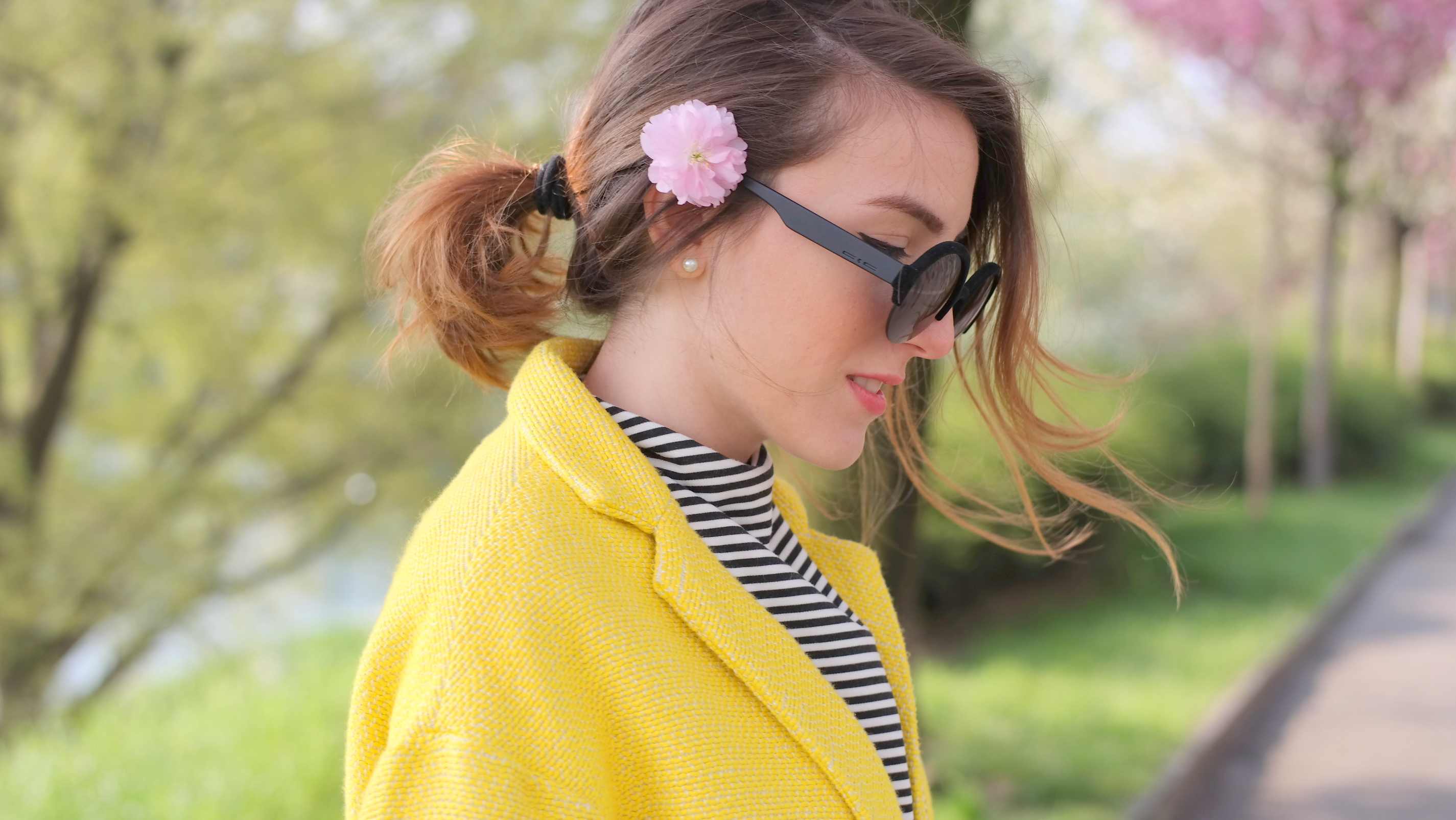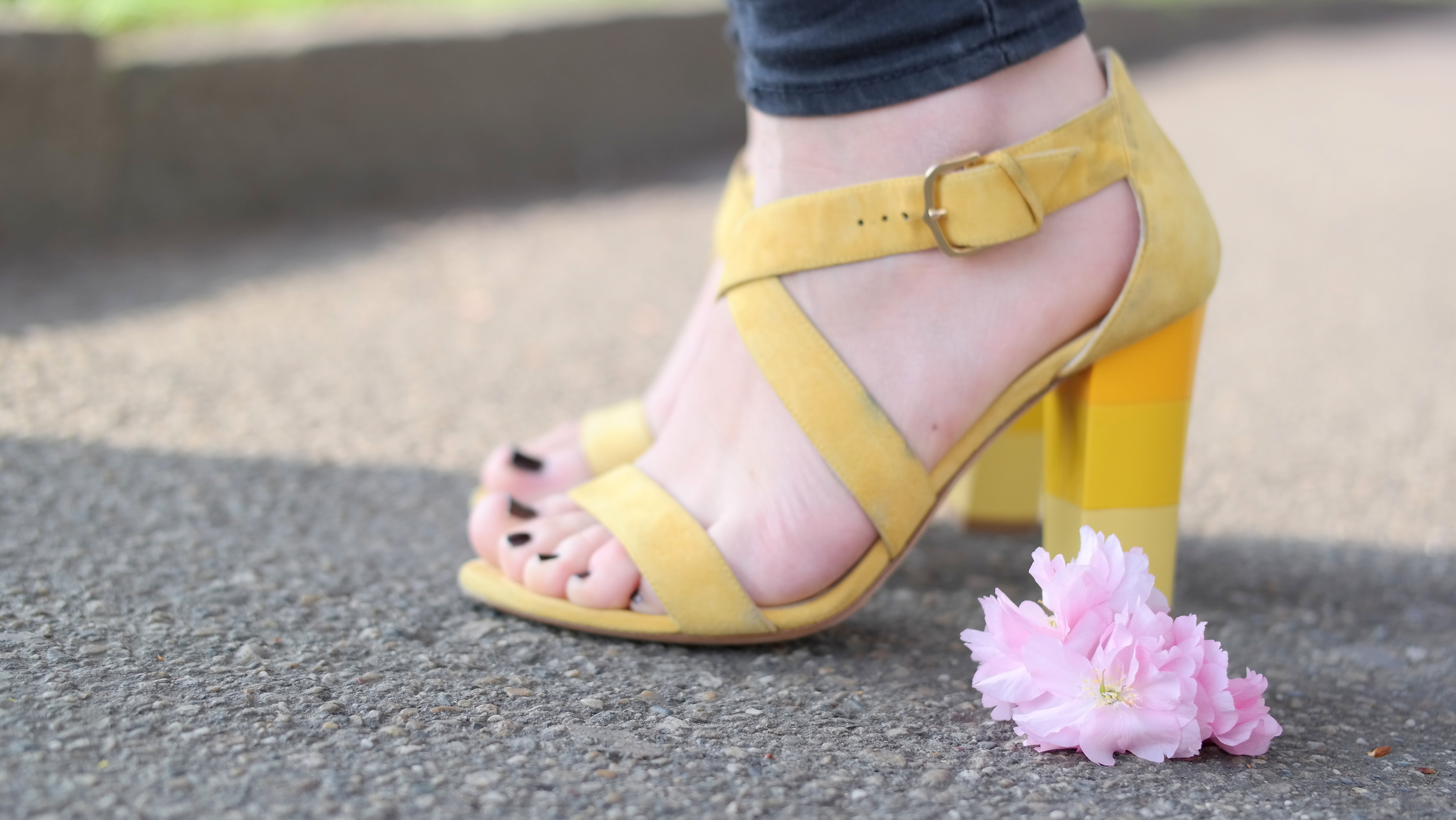 Il cappotto giallo limone firmato Asos che fa coppia perfetta con i sandali Alberto Guardiani.
