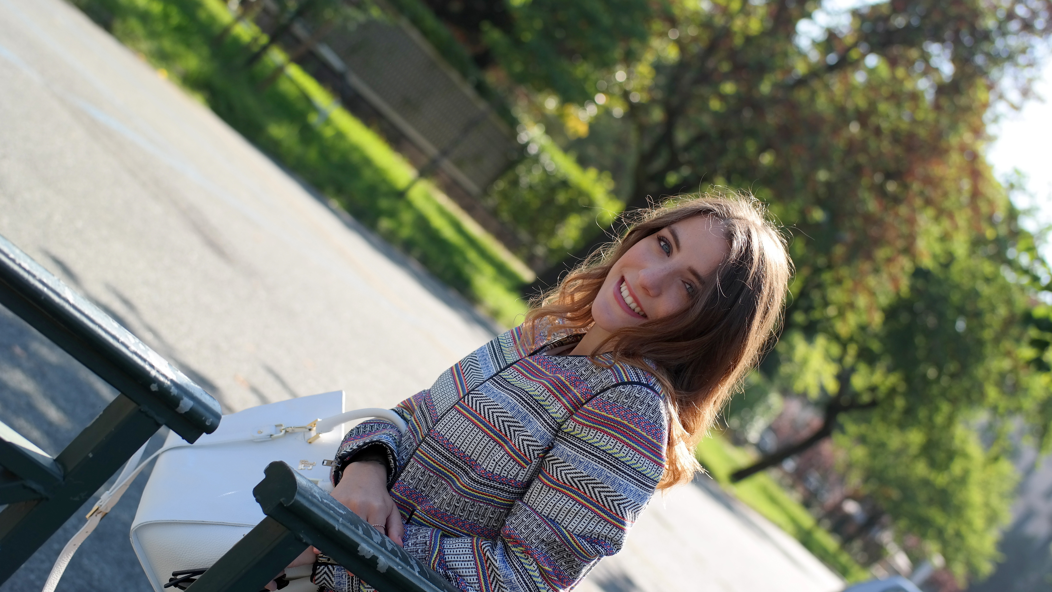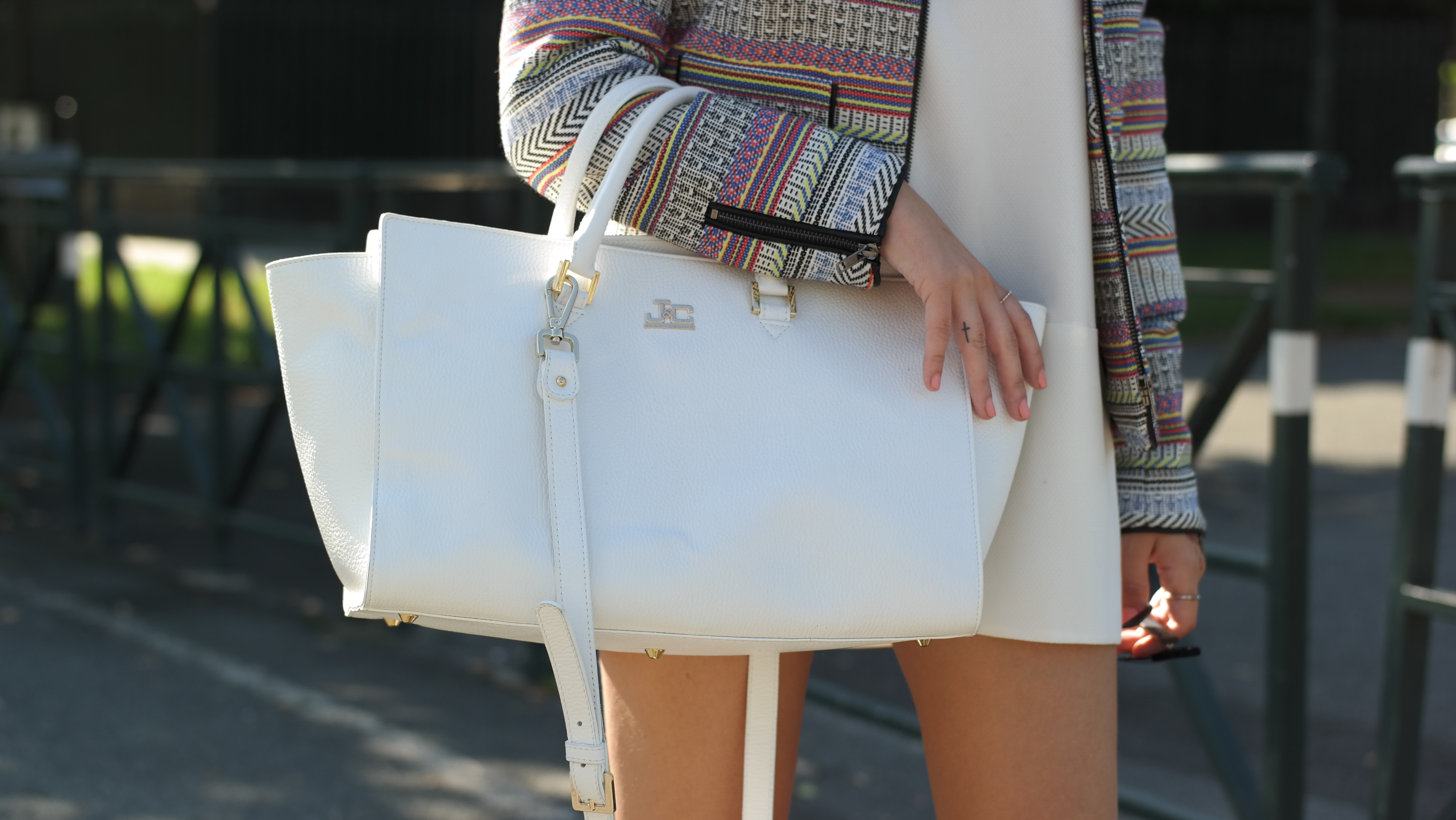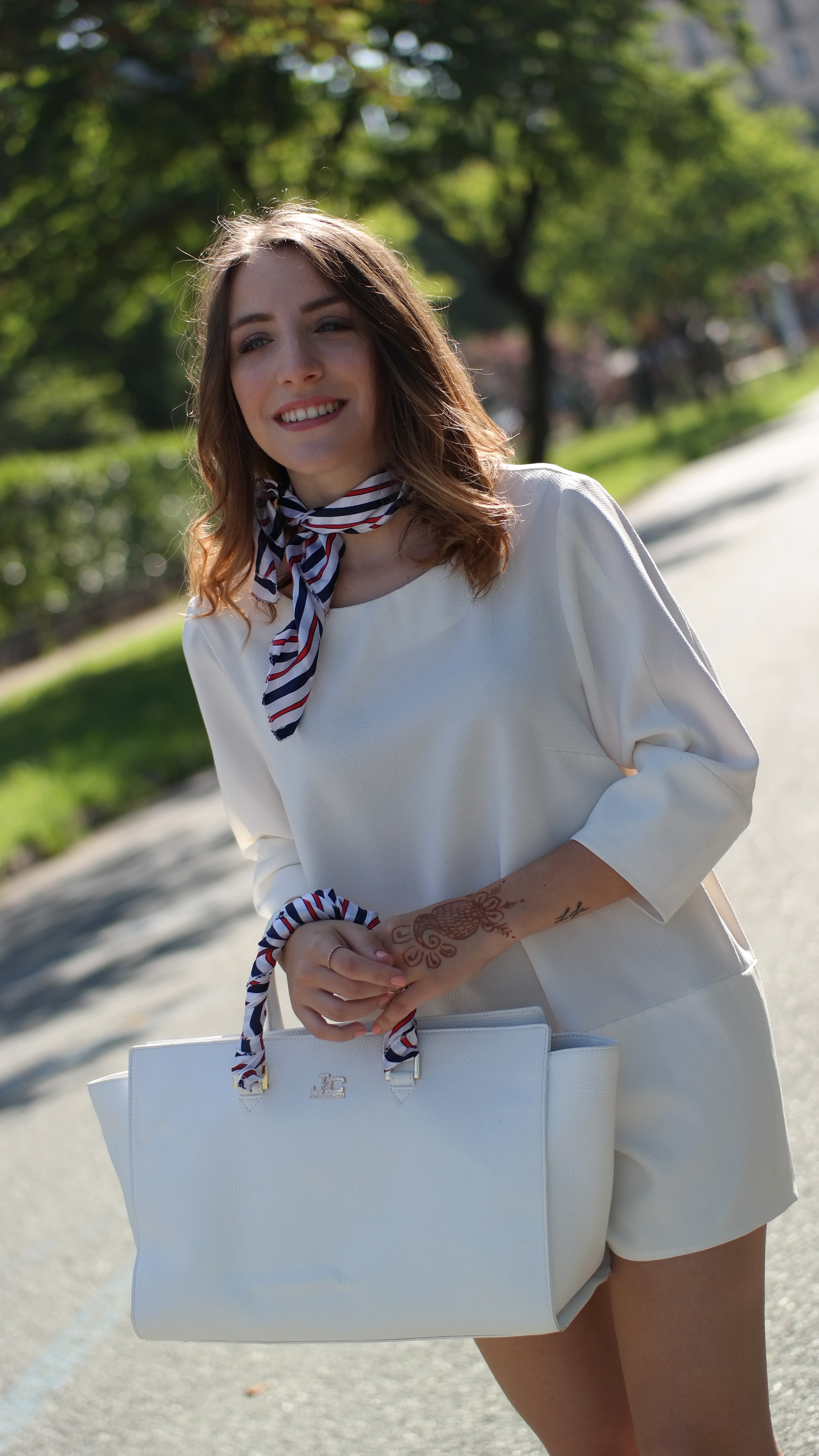 Il modello che indosso è Katy Cruise, nel colore che per me rappresenta perfettamente l’estate, la leggerezza, la semplicità e l’eleganza, il bianco, accessoriata da due foulard intrecciati intorno ai manici per rendere ancora più l’idea del mare e delle vacanze estive.
