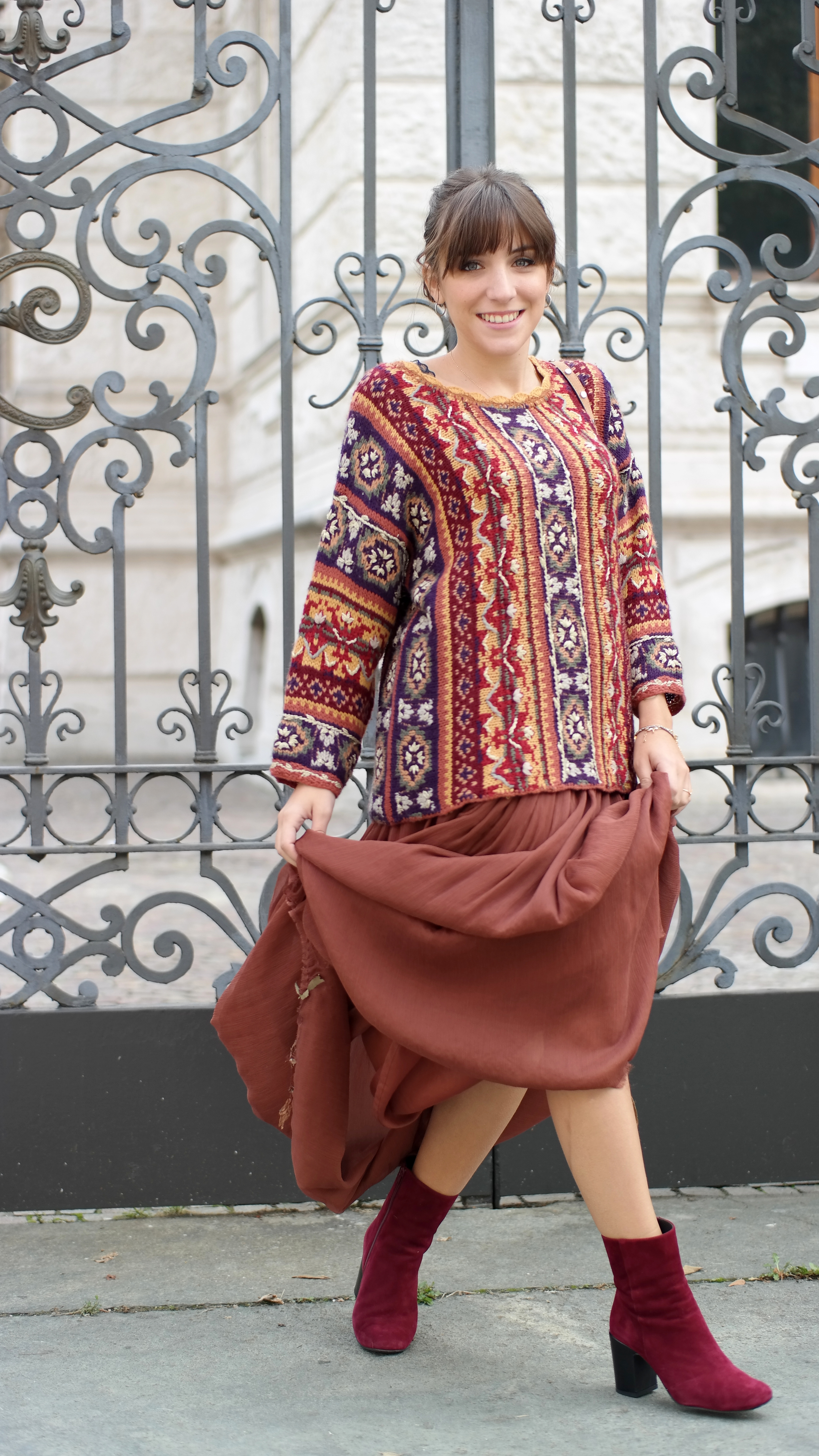 Il look boho chic è un mix tra uno stile hippie e boheme, due correnti che si incontrano tra loro tornati in voga nei primi anni 2000; Gli elementi caratteristici di questo stile/mood sono sicuramente i capi colorati ( prevalentemente borgogna, e bordeaux) stampe floreali, gonne lunghe, accessori molti accessori  e le frange.