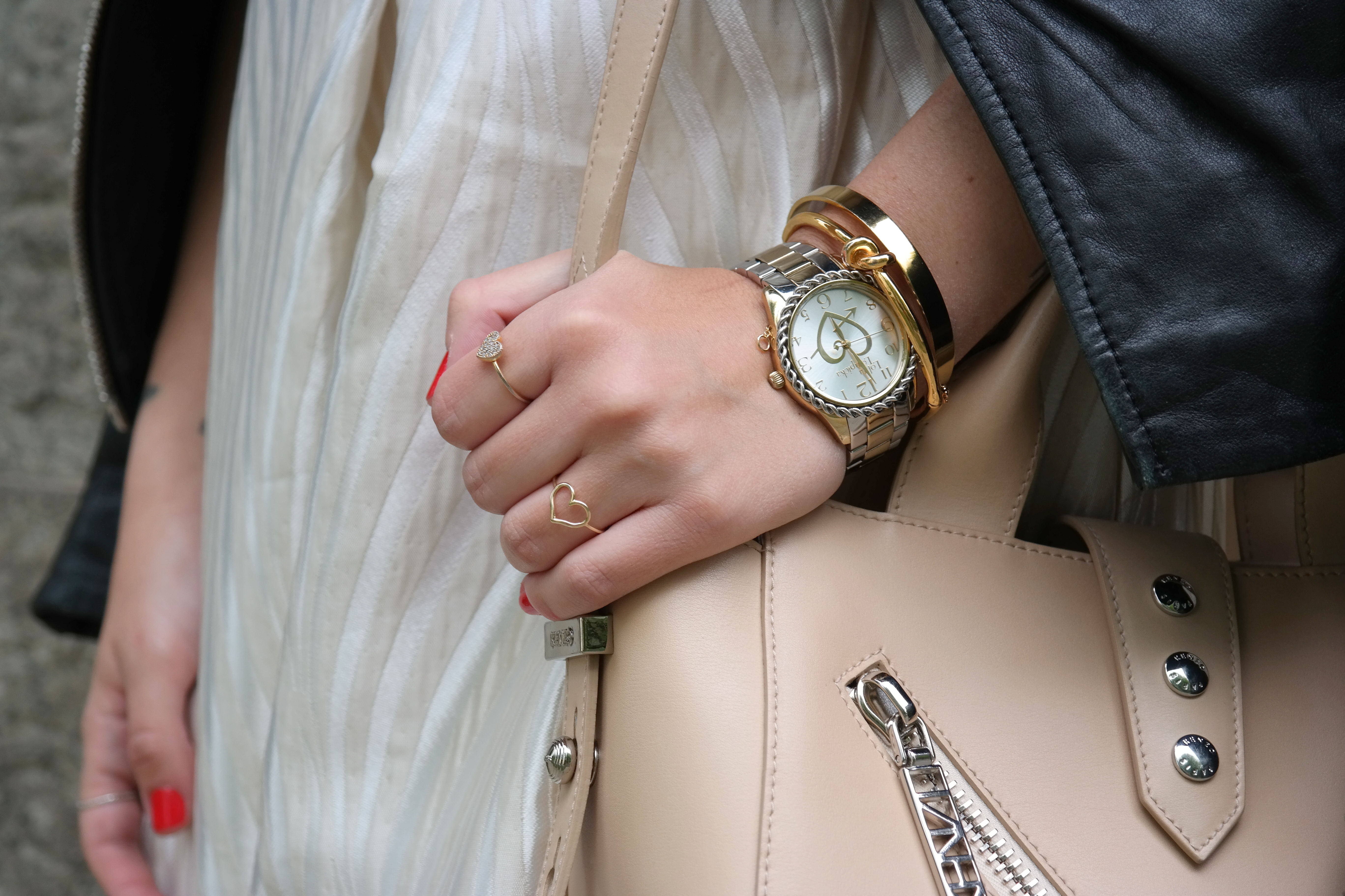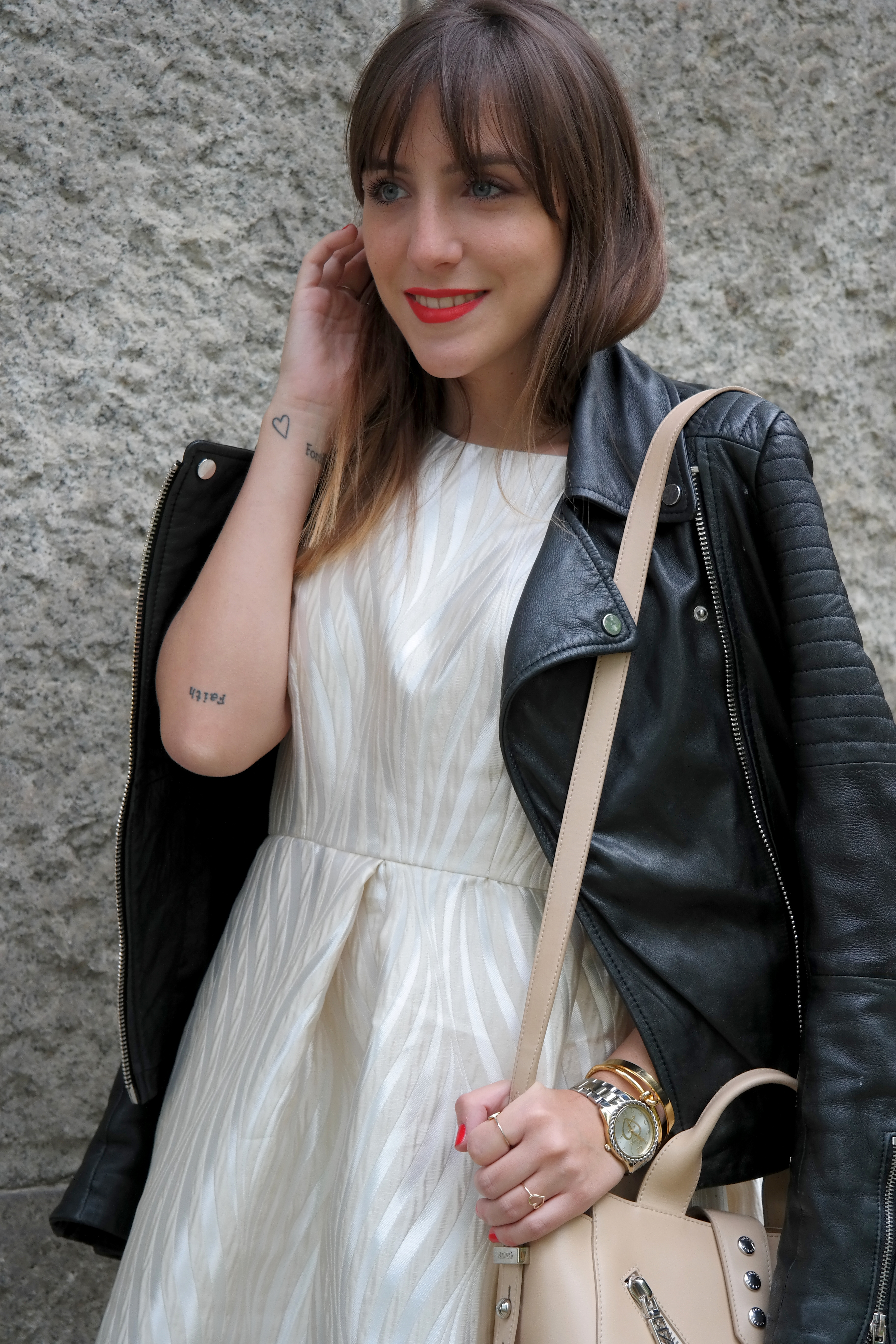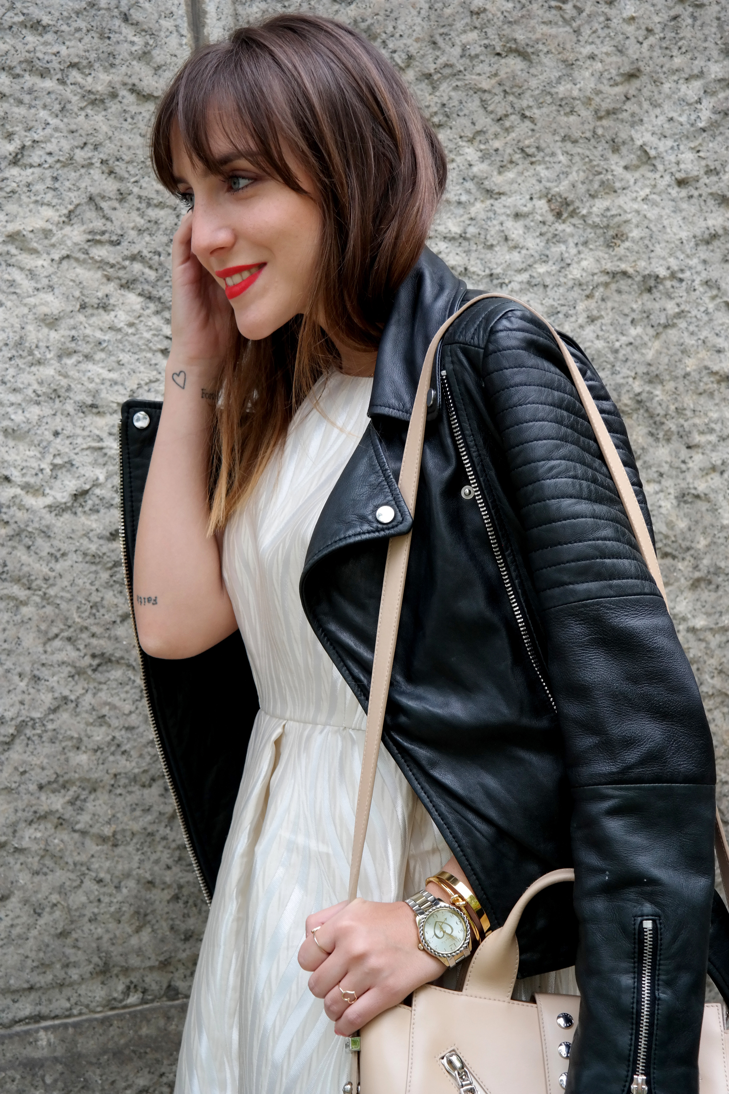 Oggi indosso un abito striato bianco e color crema del brand  Lanacaprina, dai tratti bont ton sdrammatizzato con il mio amato biker di pelle che da sempre non può mancare nei miei outfit nella quotidianità.