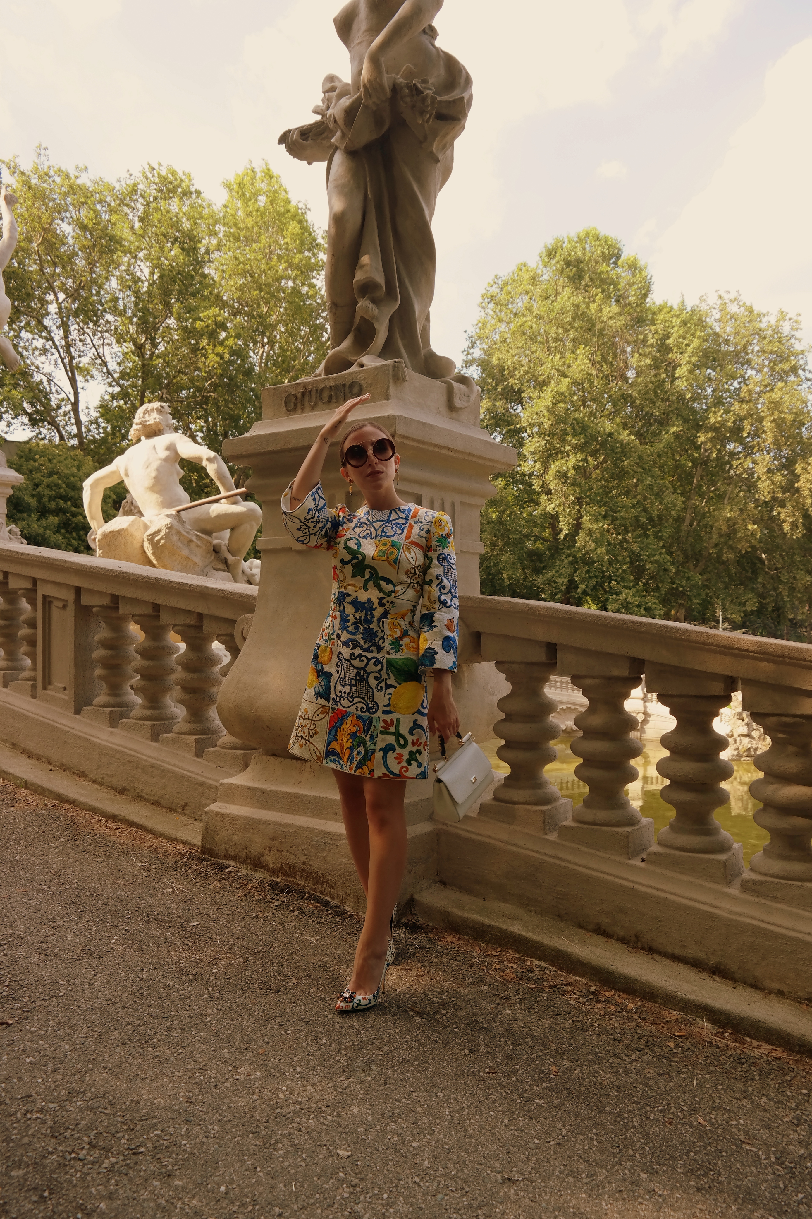 indossato in occasione per l’evento che ho voluto appositamente mostrarvi nel dettaglio in questi scatti. Maiolica, così è chiamata la collezione di abiti ed accessori che indosso. Maiolica, per chi non lo sapesse,  è una produzione ceramica di vasellame da cui ne sono particolarmente affascinata. Ad ogni modo sino al  9 Luglio potrete usufruire del servizio di make-up gratuito DG beauty in Rinascente Duomo.