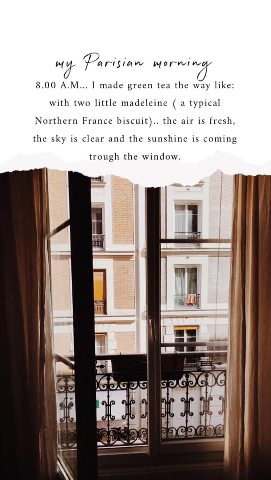 08.00 del mattino, mi sono preparata il tè verde come piace a me insieme a due madeleine (tipico dolce del nord della Francia) l’aria è fresca,  frizzante, il cielo terso ed alcuni timidi raggi di sole filtrano dalla finestra in casa.